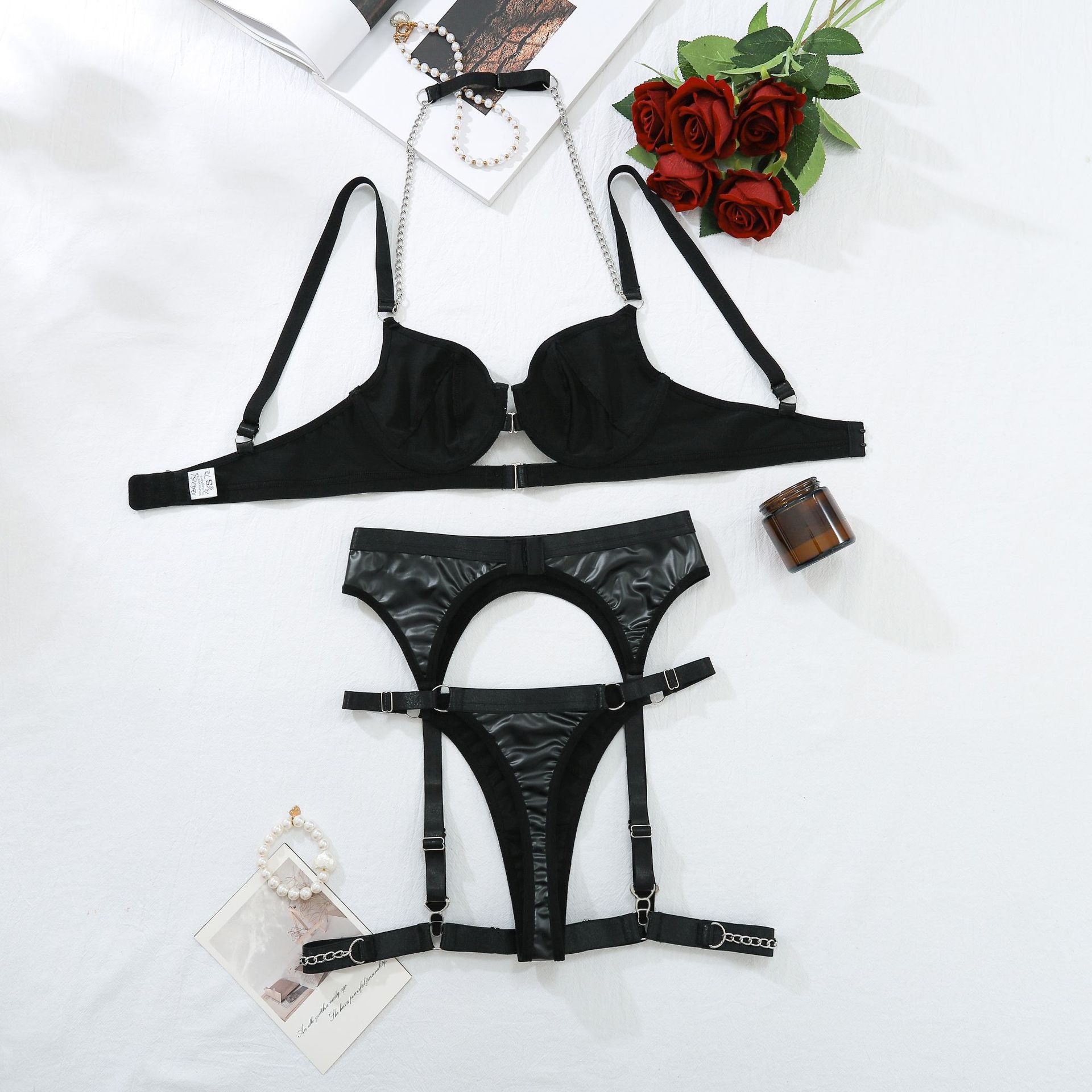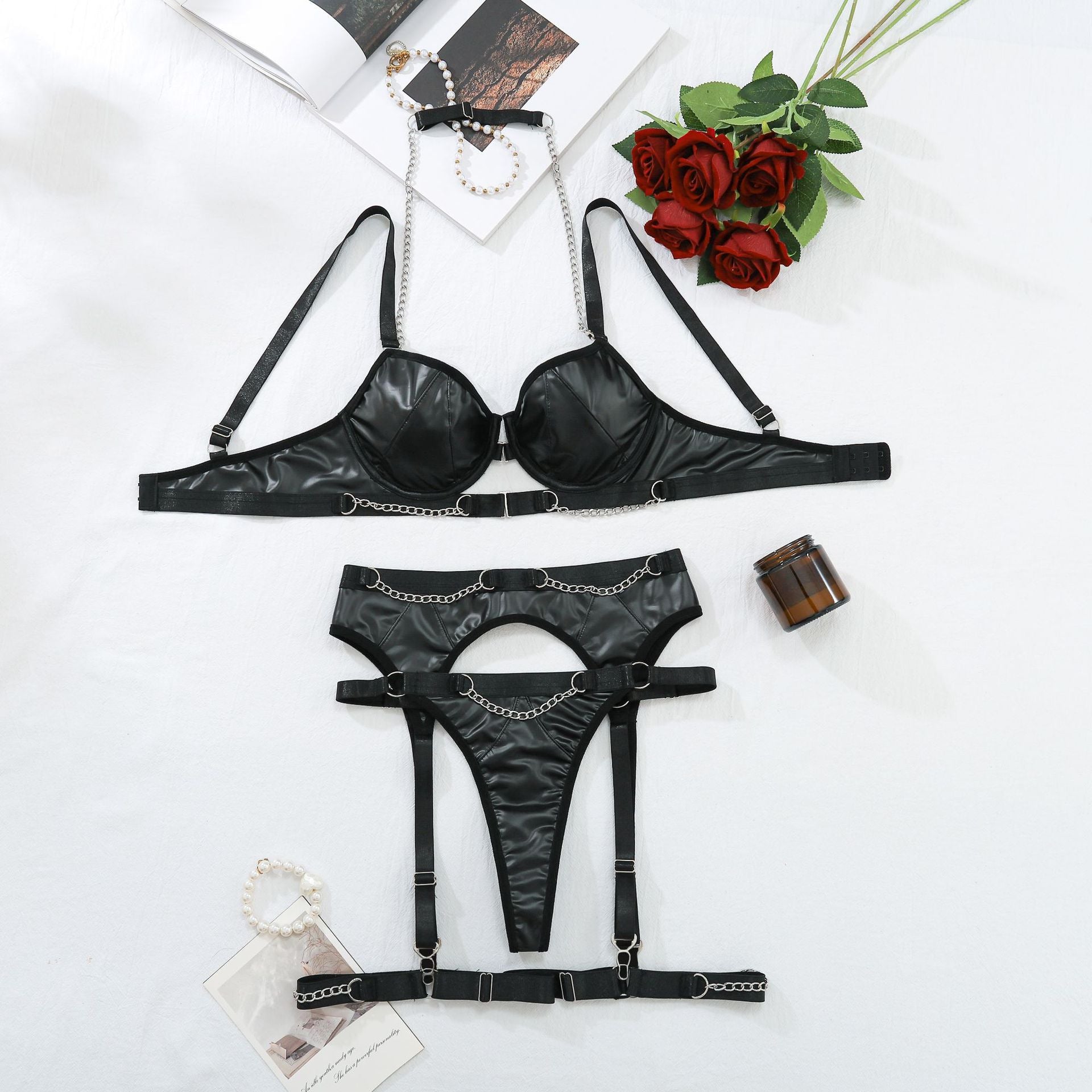 Seductive Patent Leather Metal Chain Gathering Bra Five-Piece Set