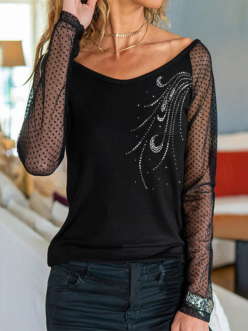 Feather Rhinestone Print round Collar Gauze Raglan Long Sleeve T-shirt