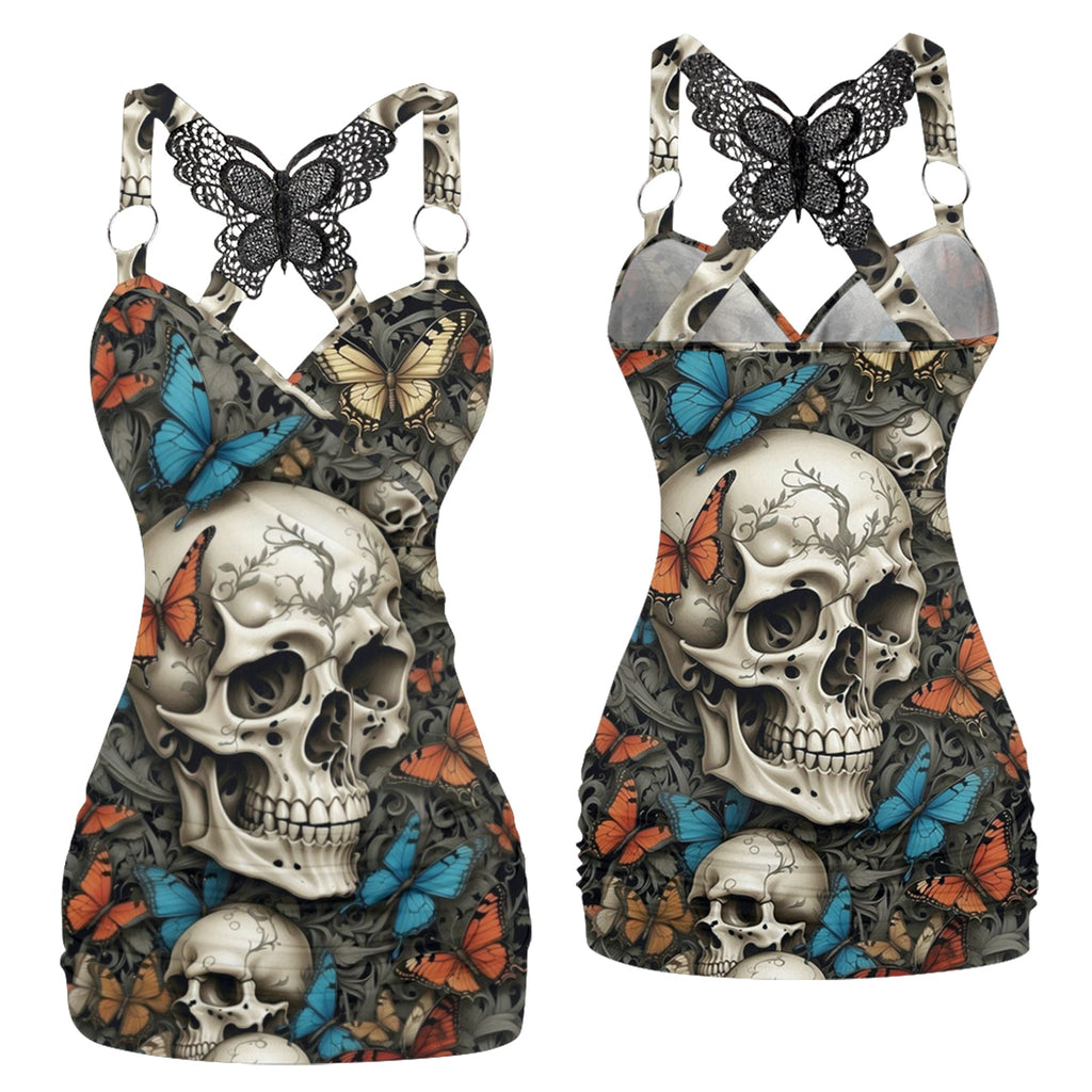 • Vintage Butterfly Skull Head Printed Butterfly Lace Vest