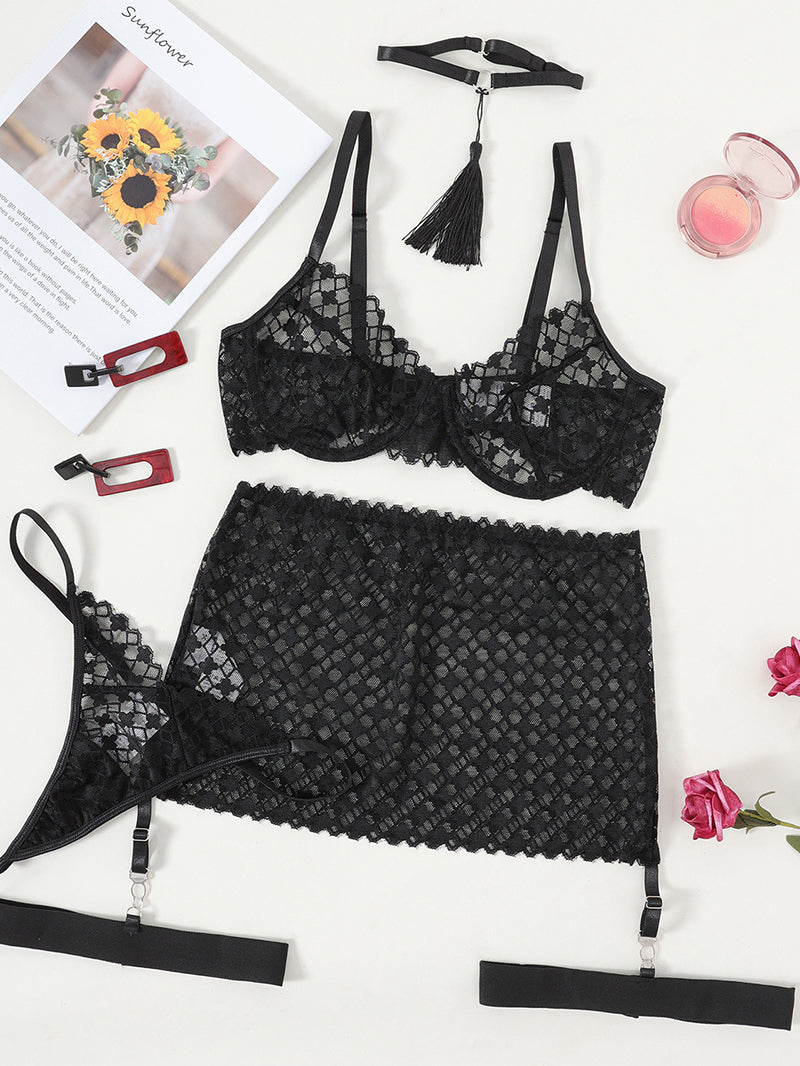 • Sexy Mesh Plaid Lace See-through Underwear Suit