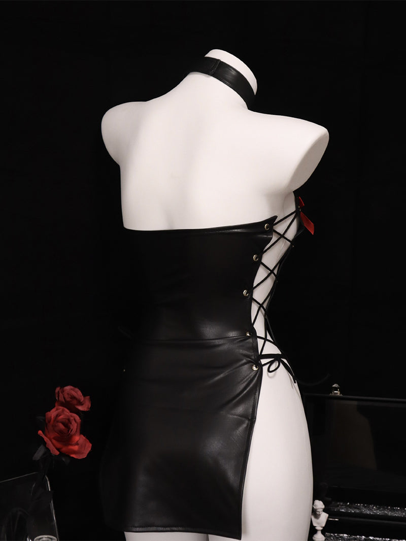 Style details: patent leather, mesh see-through halter neck stitching, chain, bow, side hollow cross straps, lace stockings