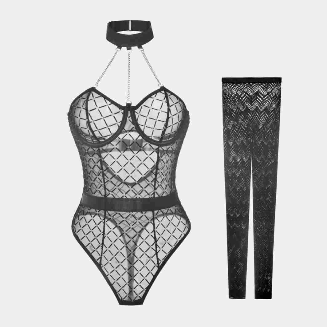 Sexy Lace See-through Metal Jumpsuit Stockings Suit